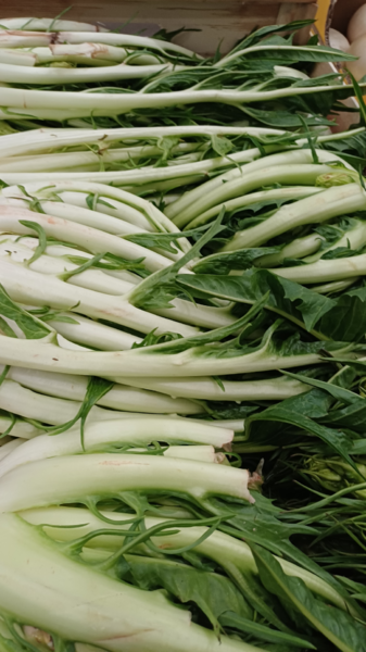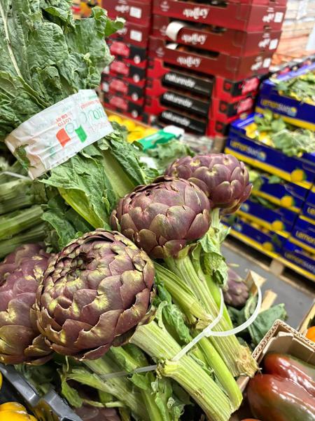 From Italy: Blood Oranges, the beautiful White Aubergines (below), Pink Radicchio, Purple Tropea (Grelot) Onions, Delica Squash, Mixed Colour Romero Peppers, Baby Artichokes & Romanesque, Leafy Celery, Cime di Rappa, Fennel, Puntarella (below), Jerusalem Artichokes.