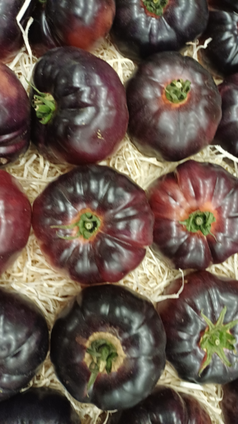 From France: White Asparagus (££), Orange/Purple Cauliflowers, Pink Garlic, Roscoff Onions, Baby Bunched Turnips, Baby Bunched Carrots, Purple/Yellow Carrots, Breakfast Radish, Gariguettes, Kohl Rabbi, dark Raf Bleu Tomatoes (below).
